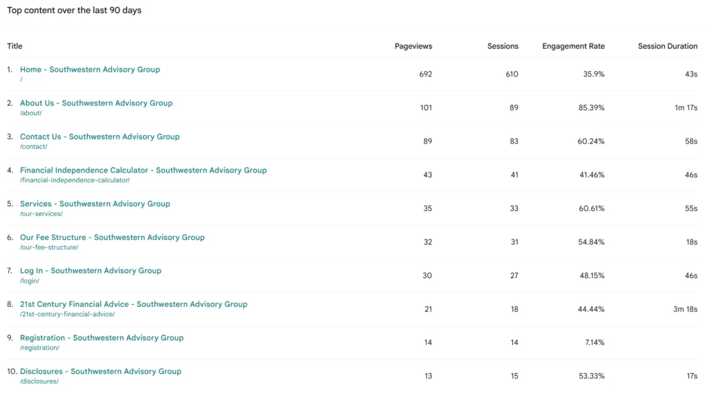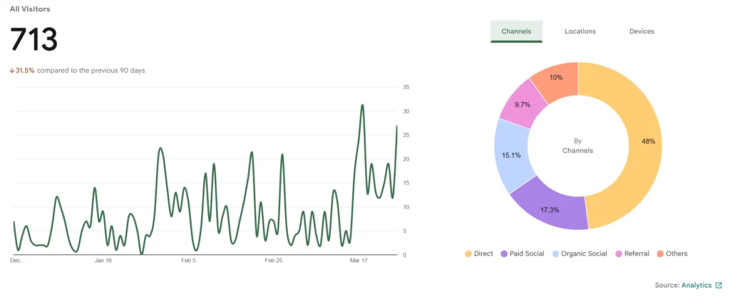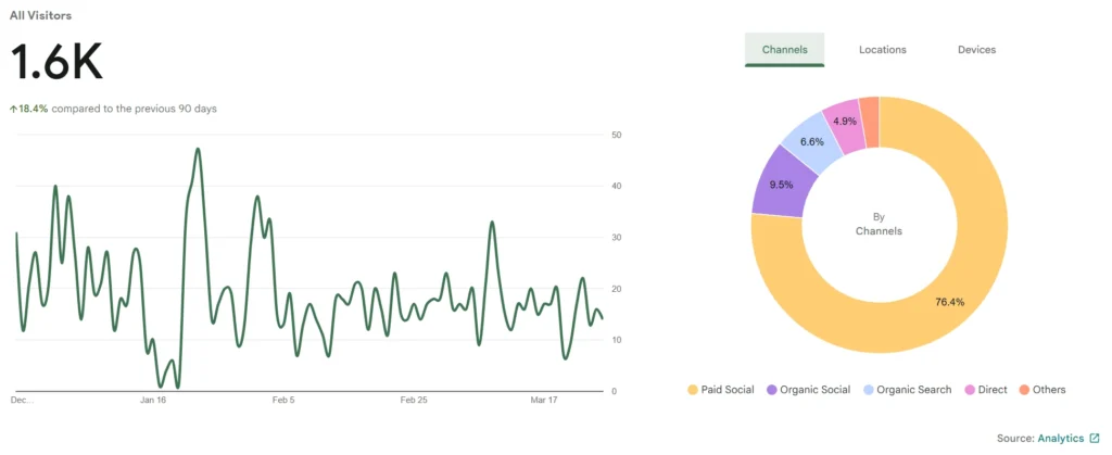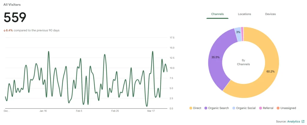 Below are website analytics for several entities I’ve worked with, comparing traffic and user engagement across the first quarter of 2026 (January–March). This side-by-side view highlights how different businesses perform over the same period and reveals key trends in visitor behavior.